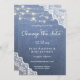Les choses changent. Envoyez à vos invités une belle modification du faire-part de mariage de date en raison de ce jean & dentelle avec des lampes à cordes invitation. Idéal pour les mariages de pays et de jardins.