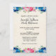 Faire-part de mariage avec une bordure botanique avec des roses roses et des pivoines roses et des panneaux bleus. L'Arrière - plan est une image de parchemin. Coloré et lumineux. Gaie et estivale. Personnalisez avec vos détails mariages.