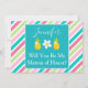 Une belle façon de demander à votre Matron d'Honneur de faire partie de votre mariage, cette invitation présente un joli arrière - plan rose, vert et bleu rayé en diagonale avec une boîte bleue et blanche au milieu. La boîte a un modèle pour customiser son nom avec "Seras-tu mon Maître d'honneur ?" écrit en belle police blanche. Personnalisez le vôtre dès aujourd'hui !