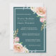 Joli faire-part de mariage fleuri avec une bordure bleu clair avec des roses aquarellés en pêche, lavande et blanc, avec verdure dans les coins supérieur droit et inférieur gauche, sur un arrière - plan turquoise foncé. L'arrière est assortie d'une nuance de bleu pastel et les deux couleurs arrière - plans peuvent être changées en n'importe quelle couleur. Les fleurs et les couleurs pastel sont parfaites pour une fête au printemps et la couleur turquoise ajoute un élément qui peut être grand en été.