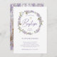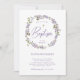 Cette belle invitation Baptême branchée présente une jolie couronne d'aquarelle aux élégantes fleurs lilas violettes vintages, avec beaucoup d'aquarelle feuillage et feuilles botaniques verts. Il y a aussi une fausse croix d'or et un script moderne violet. Au fond de l'invitation se trouve un joli cadre floral lilas, et la photo de votre bébé au centre.