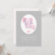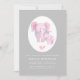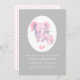Joli rose et lavande violet éléphant mère et bébé fille invitation douche. Il présente une mère d'éléphant avec son bébé et deux coeurs roses dans un cadre ovale blanc. Votre texte est gris. Le dos comprend un motif à pois.