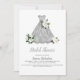 Joli design de douche nuptiale argentée avec robe argentée accentuée par des roses blanches luxuriantes.