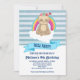 Une invitation à la fête d'anniversaire sur le thème du yoga, avec une mignonne illustration d'une paresse méditative. Portant une couronne de fleurs, assis sur un nuage blanc avec un arc en ciel coloré derrière. Quelques coeurs à proximité. Un arrière - plan rayé bleu et blanc.