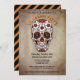 Le crâne à sucre branché Les invitations à la fête d'Halloween - le Arrière - plan ressemble à du papier taché vintage. Lit 'Vous avez été convoqué à une fête d'Halloween' en noir et orange couleurs d'Halloween. Un crâne à sucre fleuri et brillant pour les célébrations de la Fête des Morts au Mexique se trouve en-dessous.Détails du parti Halloween, y compris les informations RSVP, en noir. Le style effrayant, en bas de la lettre Goth, dit "Portez une tenue éffrayante correcte pour éviter d'être hexée". Le dos est recouvert d'un arrière - plan à rayures en diagonale noir et orange. Utilisez le bouton Customiser pour modifier l'apparence - styles, tailles, couleurs ou placement de polices. Invitations amusantes et éffrayantes d'Halloween prêtes à être personnalisées avec vos propres détails de soirée d'Halloween.
