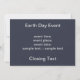 Cela peut être utilisé pour la participation des invitations à un projet de nettoyage de quartier, à un rassemblement pour une législation de l'environnement ou à d'autres événements liés au Jour des terres. Une représentation allégorique des dangers du changement climatique. Comprend une ligne d'empreintes, des "empreintes carbone", qui ont fondu à travers la banquise polaire. Le "Jour des terres" est représenté comme de la glace de séparation; les "empreintes de carbone" comme des cendres ou de la suie; peut-être des gouttes d'huile. S'il vous plaît marchez légèrement sur la Terre.