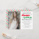 Noël Joyeux petit bachelorette invitation avec photo personnalisée et flocons d'hiver hiver hiver un arrière - plan rayé rouge et vert. Modèle photo via Pixabay sous licence CC0 et doit être remplacé par votre propre photo
