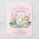 Adorable invitation d'animaux de la jungle avec un éléphant, lion, rhinocéros & girafe entouré d'un feuille de jungle pour un baby shower de filles. Retournez notre invitation pour voir un retour de coordination pour une touche spéciale supplémentaire.