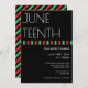 Une invitation verticale pour une célébration du 11 juin. L'invitation est rouge, noir et vert avec des lettres blanches. Customisez le texte, ajoutez cette invitation à votre panier et célébrez la liberté, les ancêtres et les progrès à venir.