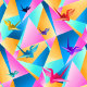 Explosion lumineuse de formes géométriques et de grues en origami.