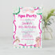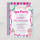 Adorable kids spa party birthday design with pastel stripes, spa robe illustration, sleep mask, and cute characters. Perfect for a girls' spa party celebration, this playful design creates excitement and sets a fun, relaxing birthday theme.