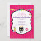 Une invitation à la fête d'anniversaire pour enfants (ou jeunes à coeur adulte). L'arrière - plan est un motif rayé rose chaud avec une parties scintillant en faux or parsemée autour. Le milieu a un cadre noir et blanc élégant où vous pouvez facilement personnaliser vos détails de fête. Le cadre est décoré d'une bannière de fête colorée, de gâteries sucrées comme des beignets de crème glacée et des macarons. Un mignon chat noir et blanc avec un halo doré est assis au fond. parfait pour un anniversaire à thème kitty chat.