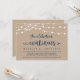 Belles lumières de chaîne de ferme rustique moderne, police de script bleu marine sur fond de papier kraft, annonce de mariage en fuite, carte d'invitation (La célébration continue). C'est parfait pour votre réception de mariage et votre fête de célébration après le mariage. Ajoutez vos détails dans la police / lettrage correspondant.