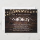 La célébration continue, Carte d'annonce / invitation de mariage en fuite, sur fond de bois de ferme rustique, avec des guirlandes lumineuses. C'est parfait pour votre réception de mariage et la fête après-mariage. Ajoutez vos détails avec la même police / lettrage.