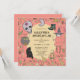 Sorcières et chats noirs et chaudrons oh mon! Une invitation à la fête d'Halloween pour enfant mignon avec une sorcière et des articles de sorcière pour pratiquer la sorcellerie. Feuilles d'automne qui coulent autour de la scène.