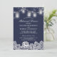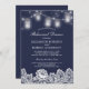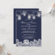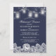 Cette invitation élégante de dîner de répétition comporte une conception blanche sensible de dentelle le long de la frontière inférieure et des pots de maçon et des lumières rougeoyants de ficelle le long du dessus. Perfectionnez pour un dîner extérieur ou rustique de répétition. L'arrière - plan peut être entièrement customisé pour assortir vos couleurs de mariage ; l'échantillon est montré avec un arrière - plan de bleu marine.