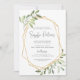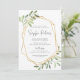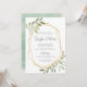 De belles invitations de douches pour bébés neutres pour les femmes sont faites de lettres grises encadrées par une bordure géométrique en faux or et de feuillage vert clair, feuilles et baies blanches. Un choix moderne dans une palette de couleurs naturelles pour les baby showers à thème boho ou nature.