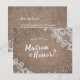 Élégantes cartes "voudriez-vous être ma témoin de mariage" en dentelle blanche vintage et paillettes d'argent sur burlap rustique. Idéal pour un mariage rustique, un mariage dans une grange, un mariage champêtre et un mariage vintage.