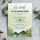 Un charmant design aquarelle avec montagnes, pins et atmosphère rustique, parfait pour un baby shower à thème boisé pour garçon. "Laissez l'aventure commencer !" Customisez facilement avec les détails de votre fête.