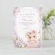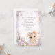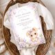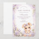 A sweet and whimsical baby shower design featuring an adorable bunny surrounded by soft lavender florals and delicate butterflies. The gentle watercolor palette of lilac, lavender, and soft greenery creates a dreamy nursery aesthetic with a light storybook feel. A tiny bow and tutu add an extra charming touch, making the design perfect for a soft, feminine celebration. Ideal for a lavender themed baby shower with a cute woodland-inspired atmosphere.