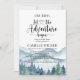 Laissez l'aventure commencer par thème baby shower aquarelle invitation avec forêt et montagnes paysage sauvage avec typographie de script de calligraphie avec coeur au milieu.