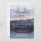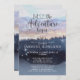 Une aventure à thème forestier commence l'invitation du baby shower bleu avec un joli paysage forestier, la ligne d'arbre et des étoiles scintillantes. Rustique et serein.