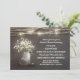 ficelez l'invitation nuptiale grise de douche de lumières avec la texture en bois d'arrière - plan de grange rustique et le pot de maçon avec le souffle du bébé.