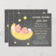Scintillement de scintillement peu d'étoile, quel beau miracle vous êtes ! Le double le miracle avec cette invitation jumelle mignonne de baby shower de filles ! Sur le croissant de lune sont deux bébés de sommeil mignons dans le rose doux ! On se repose sur un coussin tandis que les autres repos sur le premier bon à rien. Combien doux ! Le scintillement et le scintillement ficelé vers le haut des étoiles brillent admirablement à travers l'arrière - plan gris contrastant pendant que les bébés rêvent loin. Personnalisez facilement avec vos détails de partie. Grand pour que les mamans soient qui attendent les filles jumelles !