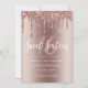 Ce design d'invitation moderne présente une texture métallique de parties scintillant à goutte d'or faux rose et cuivre rose et une police de calligraphie élégante.