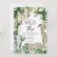 Young Wild et l'invitation de safari de trois ans présente une jungle tropicale avec paresseux, singe, girafe, éléphant, toucan et léopard. Le dos de l'invitation présente un arrière - plan empreinte de léopard avec des plantes tropicaux et le lion.