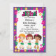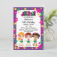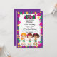 Cette invitation à la fête des enfants hawaïens de Luau personnalisable présente trois filles portant des jupes d'herbe, un arrière - plan violet avec des fleurs d'hibiscus colorées et un texte personnalisable.