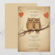 De mignons hiboux amoureux. Personnaliser cette invitation de mariage adorable est parfait pour un couple qui aime les hiboux. Le devant de l'invitation présente une paire de hiboux assis sur une branche, avec des feuilles en forme de cœurs.
