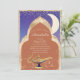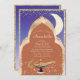 Cette élégante invitation personnalisée présente un thème de conte de fées Arabian Nights Aladdin. L'arrière - plan est doté d'un motif bleu nuit avec une bordure en parties scintillant dorée. La partie texte présente un arrière - plan couleur marron terre cuite avec un cadre doré de style marocain orné. Une lune de croissant lumineux est placée sur la droite. Une lampe magique se trouve au fond, avec de la poussière de génie magique qui s'y échappe.