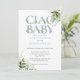 Baby shower Ciao invitation avec élégante typographie bleu poussiéreux et joli feuillage botanique. Conçu par Thisisnotme©