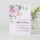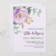 Un arrière - plan doux couleur lilas. Décoré d'un rose lilas et violet et d'une verdure d'eucalyptus vert couleur eau. Personnalisez et ajoutez votre nom et les détails de votre fête.