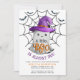 Préparez-vous à une célébration spottaculaire avec cette adorable invitation au baby shower d'Halloween ! Le design présente un charmant petit fantôme revêtu d'un casquette de sorcière violet, entouré de toiles d'araignées complexes et de chauves-souris ludiques. Le texte invitant dit : "Un petit livre est presque dû", capturant parfaitement l'esprit festif. L'arrière - plan blanche et propre renforce la propreté générale, tandis que le revers est orné d'un motif ravissant du même petit fantôme, ajoutant une touche de charme supplémentaire à cette invitation enchanteresse.