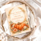 A warm and cozy fall baby shower design featuring a hand-painted watercolor pumpkin surrounded by soft peach florals, golden leaves, and delicate autumn accents. The earthy orange palette and elegant arch layout create a refined harvest aesthetic that feels timeless and inviting. Perfect for an autumn celebration, a neutral fall theme, or a charming “Little Pumpkin” baby shower with rustic floral details.