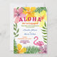 Invités Invitations dans un style tropical avec cette invitation à la fête luau avec des fleurs audacieuses d'hibiscus, des feuilles de palmiers et un flamant enjoué. Le design recto verso comprend un code QR pour RSVP, le site Web mariage et une photo du couple, ce qui le rend amusant, fonctionnel et magnifiquement personnel. Idéal pour les fêtes de plage, de jardin ou de destination.