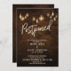 Cette carte de mariage reporté de style industriel moderne présente un mur de briques sombre et riche sur lequel sont superposées des ampoules Edison. J'ai utilisé une police manuscrite moderne pour créer un graphique qui indique "Reporté". Votre propre texte est facilement ajouté pour personnaliser ce design autant que vous le souhaitez. Utilisez les champs de modèle pour saisir simplement vos informations personnelles, et cliquez pour personnaliser davantage si vous souhaitez repositionner l'un des calques déverrouillés ou modifier votre police.