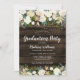 Cette invitation de fête de fin d'études à fleurs blanches est parfaite pour une célébration au thème champêtre. Ce design unique présente des fleurs aquarelles blanches, des lumières de corde et un fond en bois de grange sombre. Personnalisez facilement cette invitation avec les champs de modèle en ligne.