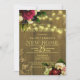 Une belle invitation traditionnelle rustique au barbecue chaud à la maison avec des bouquets de fleurs de bordeaux foncé, rouge vif et crème de pêche, et des pivoines, des cordes de lumières scintillantes et un script de calligraphie chic faux or sur un arrière - plan de bois de grange beige brun. +++++++++++++++ L'invitation convient également à toute autre nuit d'été ou d'automne rustique pays / jardin extérieur / fêtes, fêtes ou anniversaires de ferme.