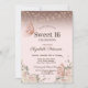 Une invitation moderne, chic et glamour avec une élégante tiare dorée, des lampes à cordes, des papillons de parties scintillant et des fleurs roses.