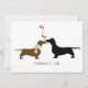 Invitation adorable de partie de fiançailles de mariage, faite dans le blanc, avec un cadre noir et rouge, autour de l'extérieur de la carte. Graphiques d'amusement d'un teckel brun et noir se faisant face, avec flotter les coeurs rouges au-dessus de eux. Tout le texte est prêt à personnaliser pour votre événement spécial. Grande idée d'invitation pour une partie d'amoureux des chiens de saucisse.