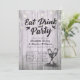 EAT Drink and Party / EAT Drink and Be Married Mariage Celebration Cartes d'invitation Modèles - Élégant Script, Lunettes de Champagne Vintage et lampes à cordes sur Rustic Wood Arrière - plan. Un Design Parfait Pour Votre Grand Jour ! Tous Les Style De Texte, Couleurs, Tailles Peuvent Être Modifiés En Fonction De Vos Besoins.