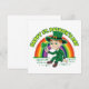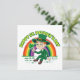 Invitation avec une illustration d'un lutrin souriant mignon portant un costume vert, un chapeau haut-de-forme tout en tenant une feuille de trèfle, avec un arc-en-ciel coloré en arrière-plan et un texte disant "Joyeuse Saint-Patrick"