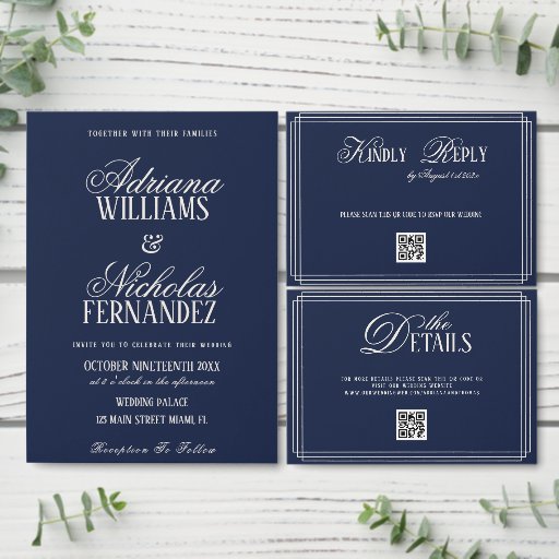 elegant old money dark blue wedding invitation