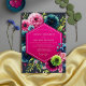 A dramatic backdrop of deep, dark hues serves as the canvas for lush, vibrant floral elements. Bold magenta, teal, and lime green blossoms intertwine with rich green foliage, creating a captivating, moody aesthetic. This design evokes an atmosphere of opulent romance.