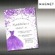 Un aimant d'invitation moderne, élégant et glamour pour une Soirée 16, 16ème anniversaire Sweet. Sur le devant : Un arrière - plan blanc avec violet, lilas pétille, une robe violette. Le nom est écrit avec un script de style moderne écrit à la main. Personnalisez et ajoutez les détails de votre fête.
