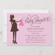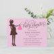 Cette invitation de baby shower comporte la silhouette d'une femme enceinte tenant une robe rose sur un cintre. Les mots "baby shower" sont écrits dans la typographie brune de manuscrit. L'arrière - plan est rose pâle. ©revidevi de graphiques.