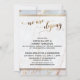 Sur une superbe image de marbre à reflets dorés, j'ai placé un bloc blanc subtilement translucide avec des bordures dorées doubles sur lesquelles apparaissent toutes les couches de texte. Le point focal est un graphique de typographie qui indique "nous nous enfuyons" avec une police de caractères calligraphiée élaborée et ornée de cœurs. Le graphique a ensuite été superposé d'un effet doré faux lisse. Vos informations personnelles apparaissent ci-dessous dans une police sans-serif en majuscules. Utilisez les champs du modèle pour ajouter vos propres informations et cliquez pour personnaliser davantage si vous souhaitez apporter d'autres modifications. Un graphique de marbre coordonné a été placé à l'arrière. Toutes les couches sont déverrouillées pour permettre une flexibilité maximale de conception. N'hésitez pas à nous contacter pour des demandes spéciales ou pour une aide à la personnalisation.